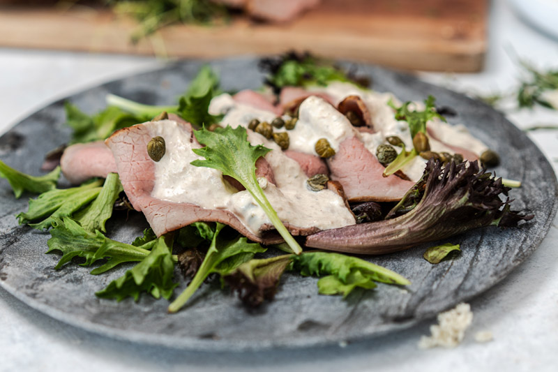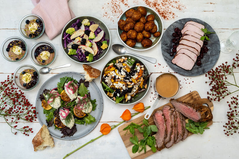 Buffeten leveres varm og klar til servering. Det eneste, du selv skal gøre, er at lune brødet og saucen samt skære det møre kød – resten er lige til at sætte på bordet. Alt det kolde er smukt anrettet på fade og i skåle, så det både er nemt og indbydende for dine gæster.