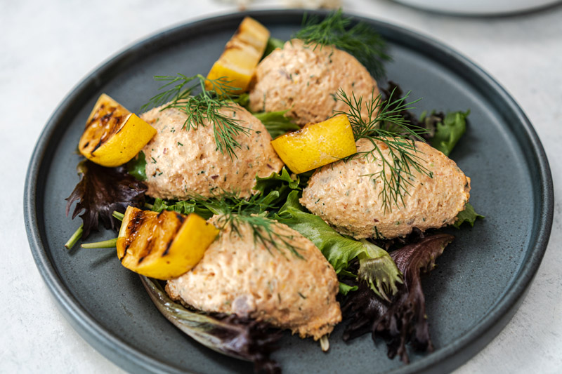 Derfor skal du gå med Frimanns Frimanns varmrøget laks rørt med cremefraiche serveret med salsa verde og grillet citron