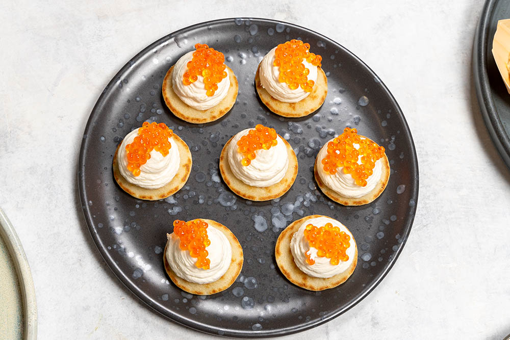 Blandt de delikate serveringer finder du en luftig citroncreme med ørredrogn, elegant anrettet på små blinis, samt en cremet crustade fyldt med svampe og karamelliserede løg. Kalvespidsbryst serveret på ristet brød med frisk gremoulata tilføjer dybde og smag, mens den varmrøgede laks rørt med cremefraiche og toppet med syltet rødløg byder på et røgfyldt og friskt element. De sprøde butterdejsgrisini serveres med en intens trøffelmayo, og små kyllingespyd marineret i karry og kokosmælk bringer varme og krydderi til bordet. En grøn spinattærte med semidried tomater tilføjer en vegetarbalance til buffeten, og afslutningsvis præsenteres friske rejer og asparges med en silkeblød hollandaisecreme – en let og luksuriøs hapser.